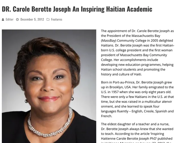A biography of Dr. Carole Berotte Joseph published in the International Kreyol Magazine